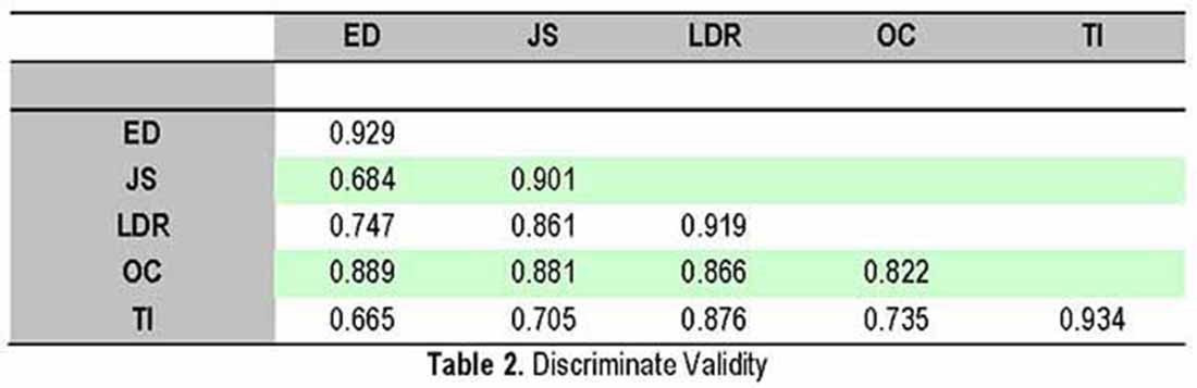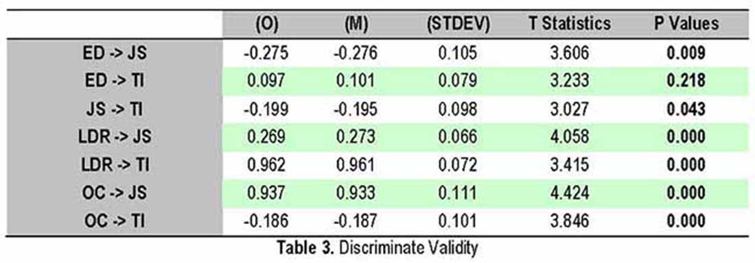 According to the findings, the standard value was not less than 0.60. The value is equal to 0.7 or greaterthan it is considered sufficient. The next step was to estimate the convergent validity (Henseler et al.: 2009, pp. 277-319). This is related to the level of relationship among similar constructs that are not related theoretically. The level of correction between the same construct measures is reflected here (Hair et al.: 2013, pp.1-12). The standard value of AVE as 0.50 or greater is used to identify the convergent element in the estimation of the construct (Henseler et al.: 2009, pp. 277-319; Mohammadi & Yekta: 2018, pp. 1-7). It is indicated by the 0.50 value of AVE that there was sufficient convergent validity. Half of the variance was explained by the latent construct and it reflected a sufficient level of convergent validity (Hair et al.: 2013, pp. 1-12).
