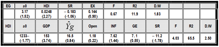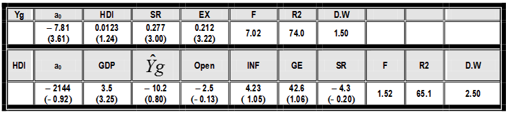 The results in the first equation showed the equation for the gross national product growth rate, the positive effect of the human development indicators index on the growth rate in Jordan, Bahrain, and Egypt at a 5% level of significance.
