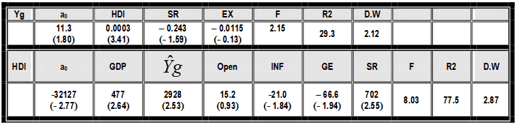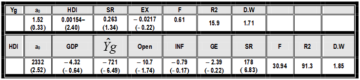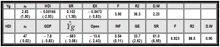Table (1) shows the results of estimating the equation of the gross national product growth rate and the method of the regular least squares (OLS) and the human development equation by means of the two-stage least squares method (2. SL S). We notice from Table (1) that the first equation is the equation of the gross national product growth rate It is noted that the positive impact of the Human Development Index on the rate of growth in this equation appeared in Jordan, Bahrain and Egypt at the level of moral 5%, that the indication of the variable of human development indicators correspond to the operative of the economic theory that the investment in human development indicators leads to an increase in the rate of output growth.