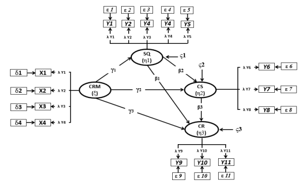 Fig. 1. Structural Equation Modeling (SEM). SQ: Service Quality; CS: Customer Satisfaction; CR: Customer Retention; CRM: Customer Relationship Management; : latent variable Y (Endogenous variable); : latent variable X (Exogenous variable); : the influence of exogenous variables on endogenous variables; β: The influence of endogenous variables on endogenous variables.