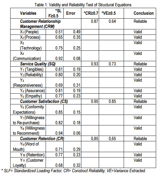 From the validity and reliability tests, the exogenous latent variables in CRM, and the endogenous latent variables in SQ, CS and CR construct valid and reliable relationship because the values of its SLF is ≥ 0.5, its construct reliability is ≥ 0,7 and its variance extracted is ≥ 0,5. It is observed that only Y64 and Y101 variables are invalid and reduced.