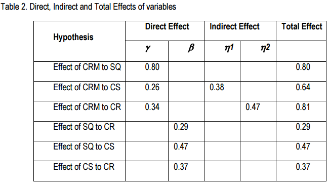 Moreover, direct, indirect and total effects of each variable can be observed in Table 2. It shows the existence of indirect effect in order to determine the effect of an exogenous variable on the endogenous variable which is dependent through endogen entervening variable. The result of indirect effect has been accordance with the desired structural model. As an example, CRM has direct and positive influence on SQ, on CS through SQ, and on CR through CS.