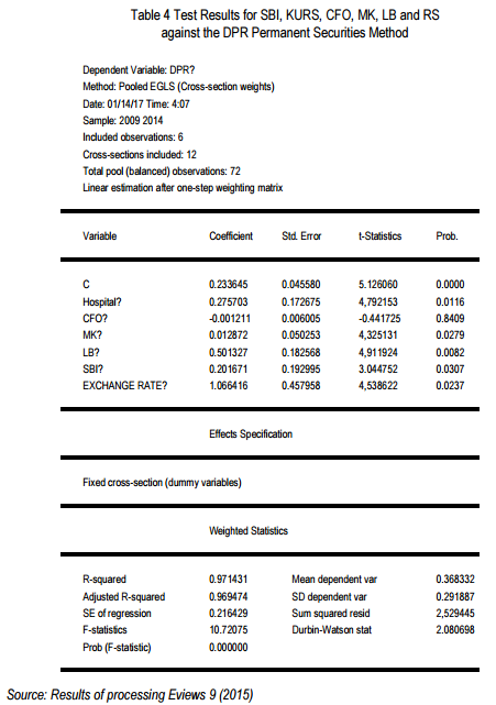 After testing with Eviews 9, it shows the results that the Constitutional Court partially influences the dividend policy, this is because the SBI tcount value of - 0.4417 is smaller than ttable 4.3251 ˃ 1.96. The concept of working capital turnover is obtained from sales divided by working capital. The higher sales will result in increased profits with a balanced level of company efficiency. In addition, the higher the profit, the greater the dividend payment target of the company. These results are consistent with research conducted by Sumarto (2007) in his research concluding that Quick Ratio, Current Ratio, Net working capital can influence dividend policy
