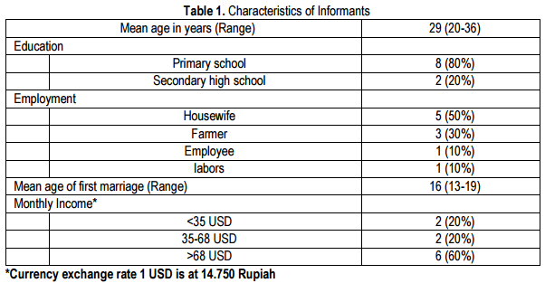 Manding District was chosen since the number of young marriage cases (84 people) in the January- October 2018 period. The study was conducted from October 2018 to June 2019. The main informants in this study were women with the first age of marriage ≤18 years in Giring Village, Manding District, Sumenep Regency. Informants were obtained through information from the village head and KUA data in the marriage registration section. The in-depth interview was chosen as a method to maintain the confidentiality of the informant by choosing a place that was considered comfortable by the informant.