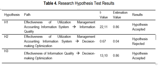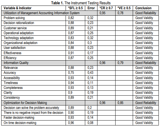 Data in Table 1 shows that the 20 indicators used declared as valid instruments. The majority value of loading factors is above 0,5, while the reliability of indicators (CR) exceeds the threshold of 0,7 and the VE value is entirely above 0,5. Thus, it concluded that all items on the instrument declared valid and reliable to measure the Utilization of Management Accounting Information System and Its Impact on Information Quality and Optimization for Decision Making.