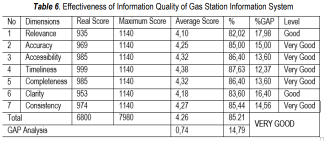 Table 6 shows that the variable declared as very good with an average score of 4,26 from 5 point scales. Nevertheless, there is still a GAP between indicators such as relevance with 17,98% and clarity with 16,40%. Overall, the system is good and everyone may access from multiplatform, PC, Tablet, Mobile-phone. It is good since everyone can remotely monitor the gas station operation from anywhere.