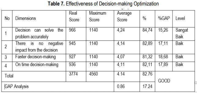 Table 7 shows that the variable declared as good with an average score of 4,14 from 5 point scales. The table also shows that there is still a GAP for faster decision-making and on time decision-making. That situation happened for the reason that there is a time buying moment when management needs to review the data from the system then they make a final statement.