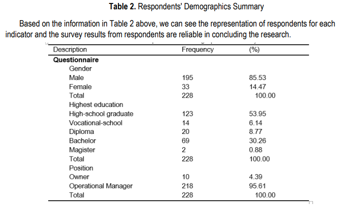 Data in Table 2 below show demographic information of research respondents. From 235 samples only valid for 228 respondents. Male respondents (85.53%) were the majority compared to female respondents (14.47%). From the level of education, the majority of respondents were high school graduates (53.95%), bachelor (30.26%), diploma (8.77%), and vocational school (6.14%), magister (0.88%) with a majority-position as operational manager (95.61%).