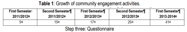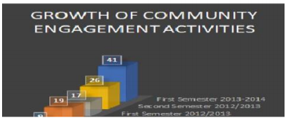 To answer the first research questions, the researchers analyzed the number of community engagement activities for the five selected consecutive semesters. The generated data showed that community engagement has more than tripled and the number of faculty members getting involved in these events has grown during this specific period as well. The university successfully executed more than 41 activities (Table 1) and events within the first semester of the 2013/2014 academic year, in contrast to the 9 activities in the first semester of 2011-2012 as shown in Figure 1.