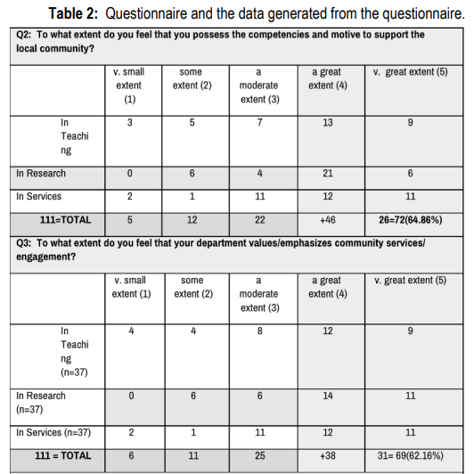 Q2: The majority of the sampled respondents feel that they are motivated to a great extent to support the local community, mainly by conducting research activities … Ranging from great to very great extent, around two third of the sample (64.87%) feel they are motivated to support the local community with research activities, followed by teaching and service activities.