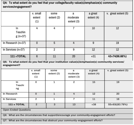 Q4: Mainly, the respondents in this study feel that the college values community engagement to a very great extent in terms of teaching, research and community service activities, but with a high emphasis on research. This indicates that each college has a clear orientation towards research activities, in the opinion of its faculty members.