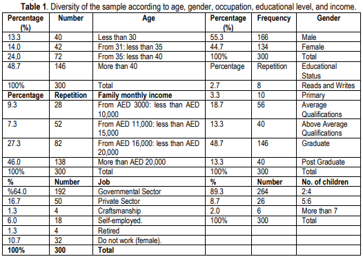 Educational level: As for the educational level, we find that 48.7% of the total sample population has a university degree, while 18.7% of the population have an intermediate qualification, 13.3% have post-graduatedegrees. While 13.3% have above-average qualifications, and 3.3% have a preparatory certificate, 2.7% of respondents have not completed primary education but can read and write. This indicates the high educational level of most subjects and emphasizes their awareness and cultural beliefs.