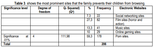 The measures and procedures used by the family to protect the child’s usage on the Internet: Table 3. shows the most prominent sites that the family prevents their children from browsing.