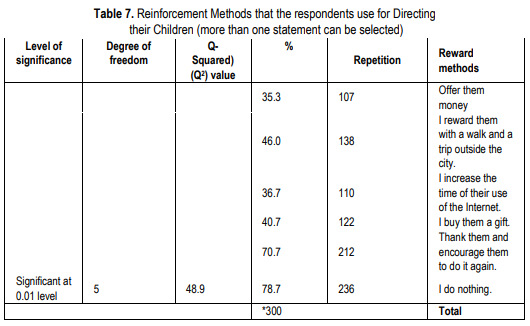 *It is clear that the number is more than 300, but the total number of answers are what meant here, as many respondents have referred to more than one method for rewarding their children.The above table indicates that 78.7% of the respondents do not reward their children when they do something good, while 70.7% of the respondents said that they reward their children morally, by thanking them and encouraging them to repeat the good behavior. About 46.0% of the respondents grant their children the opportunity to go out in a walk or a trip; while 36.7% allow extra time on the internet, which implies that the Internet has become a new method of rewarding and reinforcing behavior, and discipline in the case of deprivation.
