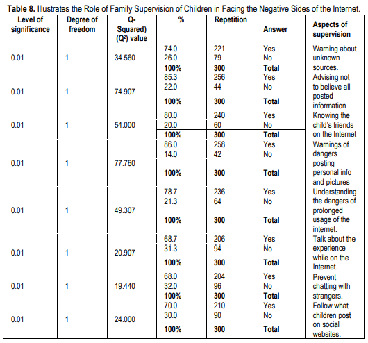 The study also attempts to consider the role and influence of the family based on the levels of existing interaction and social relationships within the home. Such family functions and roles can be considered as controls of behavior to prevent one from deviating from essential and accepted social values, habits, and traditions by safeguarding behavior and reminding the individual of the importance of compliance and consequences of violations of these views. This is achieved by the role played by the family in raising their children’s awareness and warning them of the risks caused by misuse of the internet.