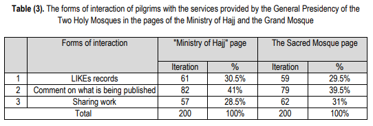 Facebook's interactive is an important feature of modern media and communication. It depends on the way we are handling dialogue and on the extent to which those who are involved in modifying the shape and content of the media environment in real-time. The social networking site "Facebook" is also characterized by the possibility of uploading videos of pilgrims and pilgrims, which contribute to the explanation of the rituals of Hajj and Umrah, in addition to interacting with them 'with admiration, comment, and sharing' through the interaction mechanisms available on the site (Almansour & Ongena: 2017). The interaction with the services provided by the General Presidency of The Affairs of the Two Holy Mosques on the pages of 'Ministry of Hajj and The Grand Mosque' is based on the reactions exchanged between pilgrims, pilgrims, and institutions of Hajj and Umrah. This has helped to create an interactive environment based on interaction, dialogue, and engagement between pilgrims and pilgrims, and some of them about the contents offered to them. So the current study will look at Pilgrim interaction with services provided by the General Presidency of Al-Haramain Affairs via "Facebook"..