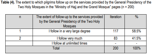 Table (2). Follow-up of the respondents to the services provided to pilgrims from the General Presidency of the Two Holy Mosques in the pages of the Ministry of Hajj and the Grand Mosque (n = 200)