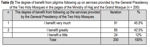 The data of the previous table indicate: The degree of pilgrims benefiting from following up the services provided by the General Presidency for the Two Holy Mosques in the pages of the Ministry of Hajj and the Grand Mosque, was as follows: (I benefit very much) in the first place by (45.5%), then (I benefit greatly) in the second place by (42.5%), and it comes in the second and last position (I benefit on average) by (12%), It is clear from the previous results: That the vast majority of the respondents benefit greatly from the services provided by the General Presidency of the Two Holy Mosques, to know the services provided to them and to learn the rituals of Hajj and Umrah, Which helps them to perform the Hajj pilgrimage, in addition to upgrading services by Hajj and Umrah institutions to improve the image of the Kingdom at home and abroad.