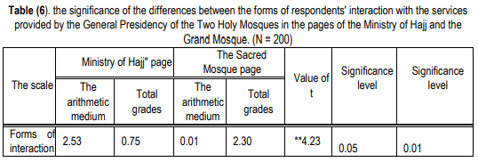 There are statistically significant differences between the forms of interaction of the respondents with the services provided by the General Presidency of the Two Holy Mosques in the pages of the Ministry of Hajj and the Grand Mosque, and in the direction of the newspaper, “The Ministry of Hajj”, And to verify the validity of the hypothesis, a T-Test was used to find the differences between the interaction forms of the respondents with the services provided by the General Presidency of the Two Holy Mosques in the pages of the Ministry of Hajj and the Grand Mosque. The value of (T) = (4.23 **), which is a function of Level (0.01).