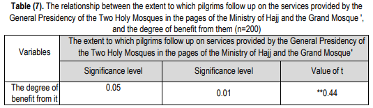 The existence of a statistically significant correlation between the extent to which pilgrims follow up on the services provided by the General Presidency of the Two Holy Mosques with the “Hajj Ministry and Grand Mosque” pages, and the degree of their use, To verify this assumption, the Pearson correlation coefficient was used to measure the intensity and direction of correlation between the extent of pilgrims' follow-up to the services provided by the General Presidency of the Two Holy Mosques in the pages of the Ministry of Hajj and the Grand Mosque, and the degree of benefit from them. The value of the correlation coefficient reached(0.44 **), which is a function at (0.01) level.