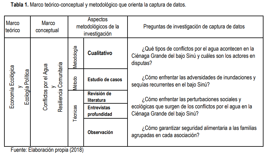 La presente investigación se ubica en el contexto de los conflictos por el agua que se origina por la deficiente calidad y disponibilidad del recurso generando limitado acceso y escasez12345. Esta situación restringe el desarrollo de actividades productivas y abastecimiento hídrico en familia campesinas e indígenas, por la afectación del sistema de humedales en la cuenca baja del Sinú6 lo que los motivó a diseñar un conjunto de estrategias de resiliencia comunitaria, construidas a partir de un conocimiento propio, para enfrentar las disputas en torno al agua7.