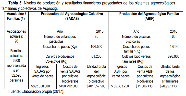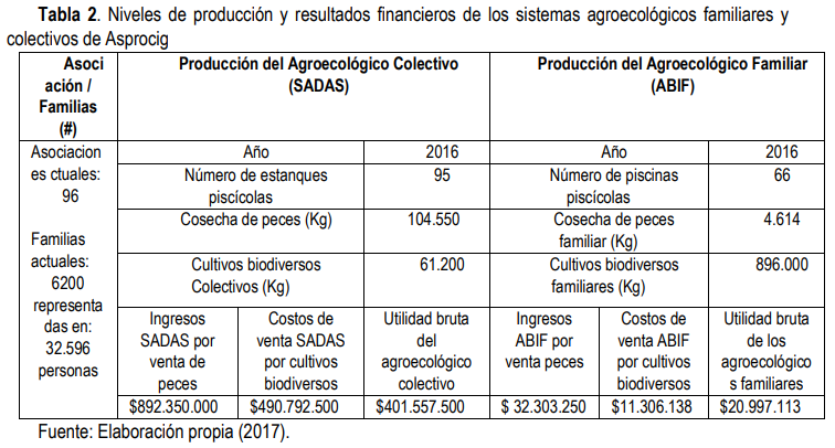 De lo producido, primero se le vende a los asociados y comunidad local a un precio promedio de $5,000 Kg, para luego ser vendido en el mercado de Lorica a $8,000 Kg, con un margen de ganancia para el asociado de $3,000 Kg. En la actualidad todos los SADAS están en un proceso de mejoramiento para elevar la productividad de peces por estanques, para ello se están adecuando con geomembranas y reducir el nivel de filtración de aguas a través de la instalación de paneles solares para hacerlos más autosuficiente y sustentables. Al interior cada SADAS existen en la parte alta de los camellones, las seis (6) especies vegetales descritas anteriormente, donde cada familia miembro de la asociación, accede a una parte de la tierra para que cultive y a su vez participe en las acciones colectivas de estos agroecosistemas. En la tabla 2 se muestra la producción de todos los SADAS y ABIF adscritos a Asprocig para el año 2016.