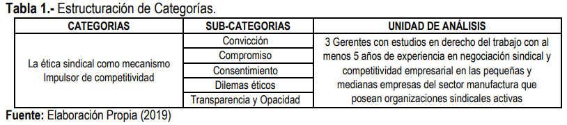 La metodología utilizada fue la metodología cualitativa a través del análisis hermenéutico interpretativo aplicado a: 1 unidad de análisis: 3 Gerentes con estudios en derecho del trabajo con al menos 5 años de experiencia en negociación sindical y competitividad empresarial en las pequeñas y medianas empresas del sector manufactura que posean organizaciones sindicales activas(ver tabla 1), a quienes se aplicaron entrevistas abiertas de acuerdo a las categorías antes descritas y se procesaron los análisis del discurso mediante: la categorización, estructuración, contrastación y teorización, utilizando como software AtlasTi8, generando la triangulación entre los gerentes de las pequeñas y medianas, conformando así la diagramación y entramado hermenéutico de los informantes claves (González-Díaz y Hernandez-Royett, 2017)