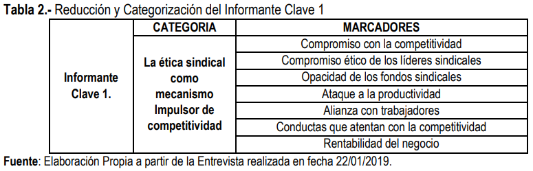 En la tabla 2 observa el proceso de reducción y categorización de la entrevista con el informante clave 1, por lo que se extraen las siguientes observaciones: en primer lugar se evidencia una serie de conductas que atentan contra la productividad, derivadas de sus estrategias de negociación con el empleador o patrono, en este sentido, el órgano sindical utiliza tácticas ralentizadoras de los procesos productivos con el fin de presionar al patrono a celebrar acuerdos muchas veces fuera del tiempo previsto contractualmente, situación que afecta gravemente a la productividad y competitividad.