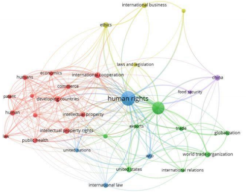 El objetivo de este estudio fue identificar las temáticas de investigación más influyentes, asociadas al comercio internacional y los derechos humanos y la relación existente entre estas. Se identificaron 31 palabras claves principales, lo que resultó en un mapa de asociaciones entre las palabras claves, por grupos temáticos. Se encontró que hay cinco áreas importantes que fundamentan la investigación de los derechos humanos en el comercio internacional. A continuación, se discute cada una de ellas.