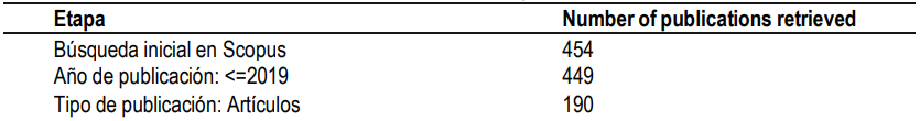 Inicialmente, se obtuvo una muestra de 454 publicaciones. Se excluyeron los textos publicados en el 2020, logrando un resultado de 449 documentos. Luego se eligieron las publicaciones que corresponden a artículos, ya que estas garantizan que los documentos hayan tenido una revisión rigurosa por pares académicos. La muestra final después de los filtros fue de 190 artículos. En la tabla I se muestra el proceso de identificación de publicaciones.