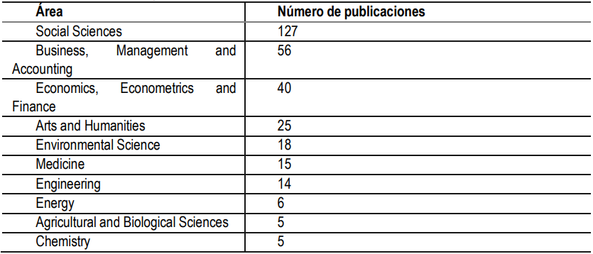Las áreas que concentran el mayor número de publicaciones son “Social Science”, “Business, Management and Accounting”, “Economics, Econometrics and Finance”, “Arts and Humanities” y “Environmental Science”. En el área de “Social Science” se han publicado el 66,84% de los artículos. Las 10 áreas con mayor número de publicaciones se muestran en la Tabla II.