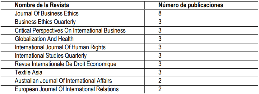 La publicación con la mayor cantidad de artículos corresponde al Journal Of Business Ethics. Esta revista publica artículos que discuten, desde diversas perspectivas disciplinarias y teóricas, las cuestiones éticas en el mundo de los negocios con el objetivo de mejorar las condiciones de vida de las personas. La relación de las 10 principales revistas se muestra en la Tabla III.