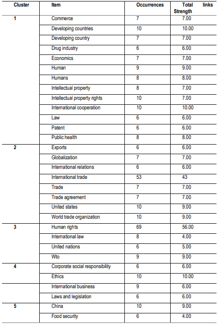 Se realizó un análisis de co-ocurrencias de palabras con el propósito de identificar los temas principales sobre las publicaciones relacionadas con comercio internacional y derechos humanos. Se seleccionó un umbral de 6 ocurrencias, dejando como resultado 32 palabras claves. Se excluye del análisis la palabra“article”, por ser una categoría genérica que no explica tendencias en los estudios. Las palabras más relevantes se presentan en la Tabla IV por cada clúster generado en la asociación, donde se identificaron cinco áreas temáticas.