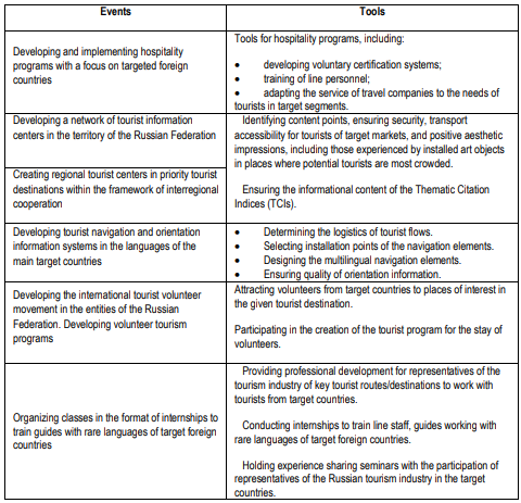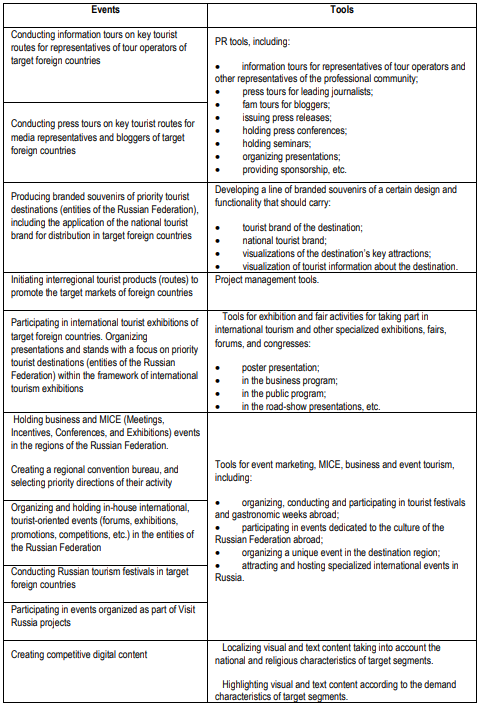 The tools used in organizing events aimed at promoting tourist destinations of the Russian Federation abroad can be divided into two groups:
