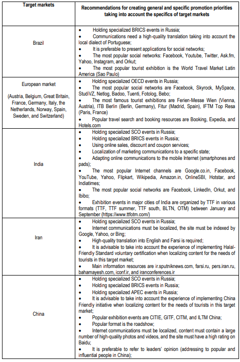 However, some common features are typical for European tourists. Thus, according to experts, more than half of potential tourists prefer to use the services of travel agencies to book an individual or group tour to Russia. Therefore, tour operators should offer the best package solutions. Besides, in the content of promotion tools, it is advisable to focus on three- and four-star hotels with good transport accessibility. Promotion tools in the European market should take into account the need to reduce the perceived risk of language barriers, visa formalities, cultural differences, and security. When planning content, it is necessary to take into account that European tourists, along with the traditional tourist program, prefer to visit sports events, get acquainted with the local culture, and take a cruise. Since the majority of European tourists who are interested in traveling to Russia are interested in news about Russia, national culture and literature, cultural centers and cultural events can become additional tools for promoting domestic destinations. Practice shows that this is a fairly effective mechanism. For example, the project "Shrines of undivided Christianity" (Federal Agency for Tourism: 2018), which promotes destinations in the Moscow, Novgorod, and Pskov regions, and other entities of the Russian Federation, was presented at the Russian Center for Science and Culture in Madrid at the presentation session of Russian cultural institutions and regions "Russia and Spain: dialogue through culture and educational tourism".