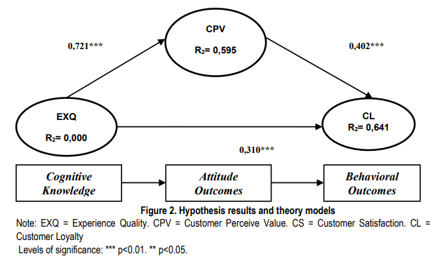 Based on the results of the above hypothesis testing can be said that the overall hypothesis proposed in this study received. This confirms a theory advanced by Bagozzi (1992) namely attitude theory that affective attitudes are formed on the basis of cognitive attitudes through an action behavior in decision-making so that ultimately will form an outcome behavior. Based on the research results can be a conclusion cognitive attitude that what is meant is that the overall quality of the experience is the experience of the products and services. Affective attitude to that question is the customer perceives value, namely the value expected by the consumer as well as the results of the behavior in question is customer loyalty, which is a result of the impact of the experience quality and customer perceived value. It can be drawn the conclusion that consumers gain experience in terms of the products and services that match their expectations and get satisfying service then the results of the final behavior conducted by the consumer is doing the purchase. give positive comments and recommend to others.