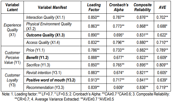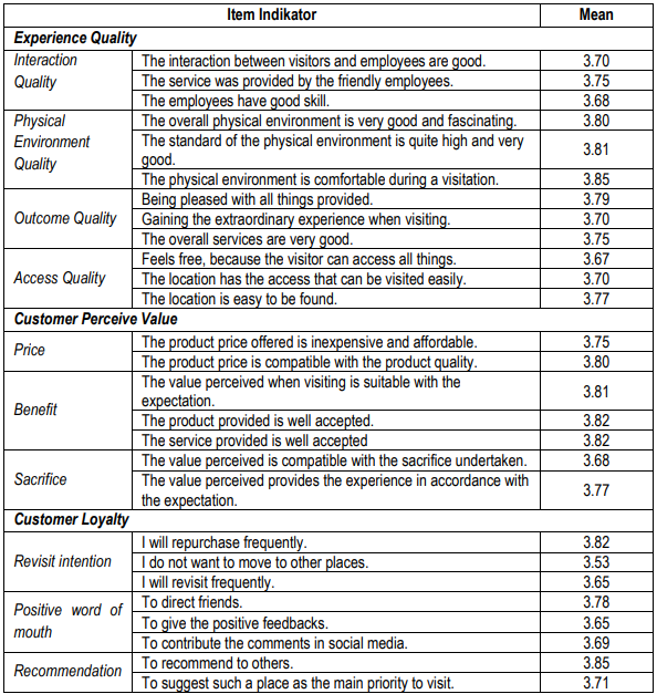 The results, shown in table 1 indicate that a variable has the value quality experience an average of 3.75, indicators of physical environment quality have the highest value items namely physical environment provide comfort while visiting. Variable customer perceive value has an average rating of 3.78, indicators of benefit have the highest value i.e., products and services can be received well. Memilikki customer loyalty variable average value of 3.71, indicator recommendation had the highest median value i.e. items recommend to others.