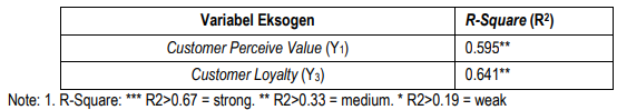 Table 3 presents the results of the analysis of structural equations with PLS through test results of inner models used to figure out the relationships between variables. Inner evaluation of the model can be seen from the results of R-square value (R2) on the endogenous variable that indicates that the variable customer perceives value being influence 0596 and variable customer loyalty and give strong influence with a value of 0704 (Ghozali Latan, 2012). The results of this research show the value Predictive Relevance (Q2) of 0959 so it can be said that the equations model structural in this research has the goodness of fit is good.