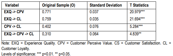 Hypothesis testing is done by the method of bootstrapping using smartPLS 3.0 applications. A positive and significant relationship between experience and quality with the customer perceived value can be seen from the results of testing with the H1 line coefficient of t-0771 by the value count of 20,979 as well as the value of the p-value of 0000. A positive and significant relationship between quality experience with customer loyalty can be seen from the results of testing with the H2 line coefficients of the t-0759-value count of 21,694 as well as the value of the p-value of 0000. A positive and significant relationship between customer perceived value with customer loyalty can be seen from the results of testing of the H3 with the variable path coefficient value customer perceive value against customer loyalty of 0402 with value t calculate 0076 as well as the value of the p-value of 0000 so that it can be said that the customer perceives value has influence in positive and significantly to customer loyalty. The role of the effect of customer perceived value in mediating the relationship between experience and quality with customer loyalty can be seen on the test results with the H4 line coefficient indirectly totaling 0.402 with t-value calculate results of 0064 as well as the value of the p-value of 0.000. This explains that the customer perceived value does not provide both mediation effects perfectly aswell as between partial experience quality with the customer perceive value despite having significant and positive values.