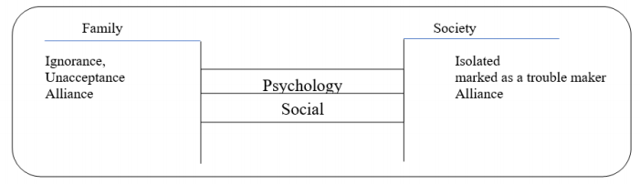 The scheme above shows that the families of the women in warung remang tend to ignore them. The family had less attention, even non-existent. Their presence in the family is not expected. In this case, the alliance understood as a form of punishment against her. As a prostitute, their actions had been considered as a disgrace and broke the family's dignity. In society, the women of warung remang have excluded from people. They are not expected to hang out and mingle with them. It is a kind of fear that their behaviour can affect other community members. In this case, the isolation from the community as a form of social sanction, which makes them increasingly punished, and they are getting along to the world of prostitution.