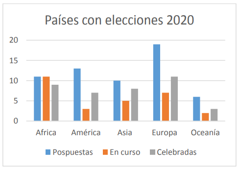 ¿Qué significa postergar las elecciones? ¿Cuál es el impacto que tiene el acontecimiento sanitario en las elecciones de 2020? La realización de votaciones periódicas para elegir a los representantes del gobierno ha sido una de las características de la democracia (Sartori, 2006). Los tipos de gobierno y los sistemas electorales funcionan desde el ordenamiento constitucional de cada país, bajo estas características legales se desarrollaron los procesos 2018 y 2019, empero, el año 2020 presentó un quiebre en la dinámica de la democracia electoral porque un bloque de países ha suspendido sus elecciones, mientras otros las continúan, todo esto, ante la amenaza sanitaria de la COVID-19.