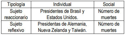 El número de muertes tiene variaciones en cada país. Los liderazgos también son diferentes, al igual que la respuesta de la población. Las decisiones para tomar o no medidas en el tiempo de inicio del contagio, de aislamiento oportuno a personas que ingresaron al territorio, la aplicación de pruebas, e incluso uso de cubre- bocas por parte del Primer Ministro y Presidente de la República muestra los tipos de sujetos reflexivos o reaccionarios ante este acontecimiento.
