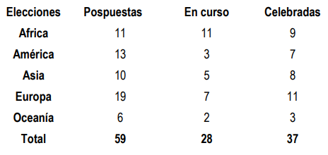 A partir de la decisión por país para posponer o celebrar elecciones, se presenta la información de la tabla y de la gráfica que acumula el número de países por continente, y el rumbo de las jornadas electorales 2020. La base de datos incluyó a todos los países del mundo con elecciones programadas para el año 2020. La contabilidad se realizó por país, incorporando tipo de elección: nacional, sub-nacional, local, zonal vecinal e incluso elecciones plebiscitarias. Cada elección por país se registró bajo la tipología siguiente: pospuesta, en curso y celebrada. El corte de la información se realizó el 15 de julio de 2020.