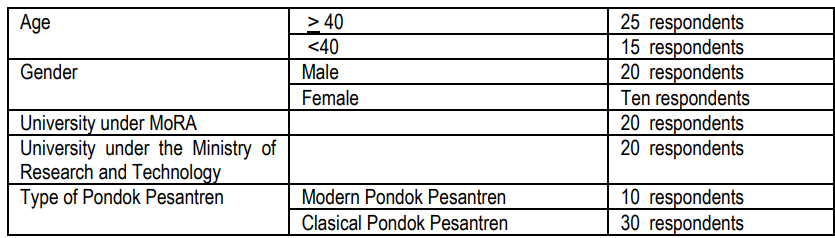 The main objective of the research is to prove the assumption that boarding school education makes its students become inclusive and tolerant. For the purpose of the study, the researchers decide to apply primary data search as in distributing a set of questionnaires to selected respondents. Five questions on self-identity, religious learning experiences in Islamic boarding schools, concepts of truth outside the group and school of thought, religious tolerance, and the concept of Khilafah were asked in the questionnaire. Each response to the question shows the level of religious views of the respondent, which is inclusive and exclusive. In four major cities, Bandung, Yogyakarta, Semarang, and Malang, university lecturers took samples. Two universities, namely universities under the Ministry of Research and Technology and universities under the Ministry of Religious Affairs, were taken from each city. The choice of these two types of universities is to make conclusions more objective. Furthermore, from each university, five lecturers were taken randomly as respondents. Therefore, the total number of lecturer respondents who filled out questionnaires was 40 people. The detail respondents can be seen in the following table: