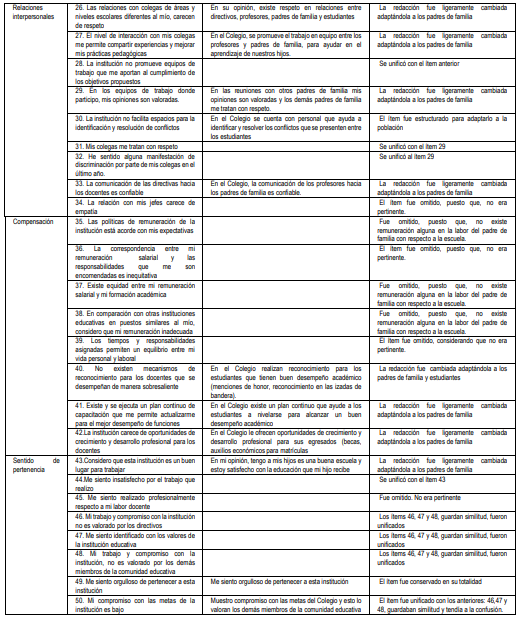 En otro caso, utilizando una metodología cuantitativa y teniendo en cuenta distintos niveles y escalasdiseñadas por autores especialistas en la medición del clima organizacional, fue diseñado por Canchón, Plaza y Zapata (2013), un cuestionario compuesto por 50 ítems, aplicado a 432 docentes de instituciones de educación básica y media de Bogotá. Del estudio fueron propuestas seis dimensiones: estructura y procesos, infraestructura, toma de decisiones, relaciones interpersonales, compensación e identidad/sentido de pertenencia. El instrumento fue validado y la confiabilidad obtenida fue alta, lo que permitió concluir que el instrumento cuenta con propiedades psicométricas adecuadas y aporta un diagnóstico efectivo de clima escolar desde la percepción docente. Es un antecedente que aporta información valiosa para el estudio en proceso, puesto que, al desarrollarse en el campo educativo, marca pautas específicas para trabajar el clima organizacional desde la escuela y puede tener elementos que se relacionen con la perspectiva de los padres de familia como miembros de la comunidad educativa y su percepción de la institución educativa.