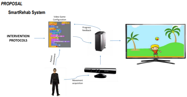The developed remote rehabilitation system in virtual reality environment "SmartRehab", is shown in Figure 1, where the main elements can be observed. The system starts from the intervention protocols design considering the patient characteristics, after having made an assessment. The assessment establishes the intervention protocol allowing to adjust the challenges that the patient would have to face in the video game. The patient's movements are received through the Kinect, which sends the data to the software developed by using Scratch. The software, through internal coding connecting to the Kinect SDK, performs image processing for decision-making. One of the video games’ code is shown in Figure 2 (Frog). It allows easy configuration, so that therapists can change and adjust the challenges of each therapeutic intervention in an interactive, friendly and fun way, according to progress and motivating the patient to continue with his evolution.