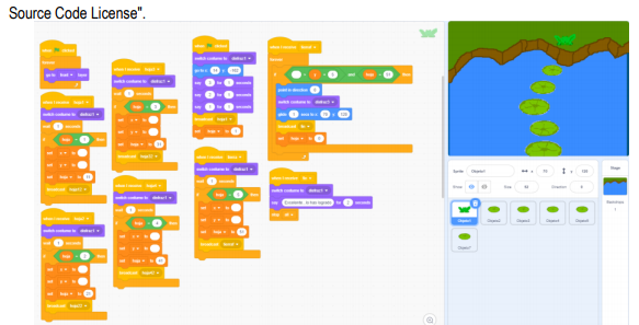 Scratch® is a visual programming language developed by the Lifelong Kindergarten Group at the MIT Media Lab (Scratch, 2018). It manly allows to develop mental skills by learning programming without having deep code knowledge. Its characteristics linked to the easy understanding of computational thinking have made it widely used in education for children, adolescents and adults. Scratch allows users to use event-driven programming with multiple active objects called sprites. The sprites can be painted as vector graphics or bitmaps, from the Scratch website itself by using a simple editor that is part of the project, or they can also be imported from external sources including "webcamera". Scratch 1.x source code is under GPLv2 and "ScratchSource Code License".