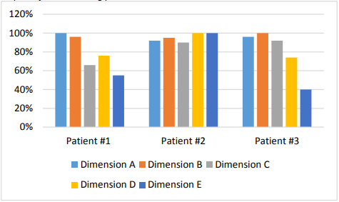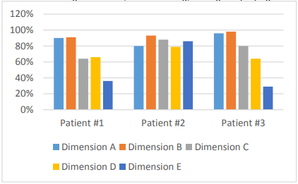 Figure 4 shows the results of the initial assessment, where the score in patient #1 in lying and rolling (dimension A) is observed to reach up to 90%; sitting (dimension B) 91%; crawling and kneeling (dimension C) 64%; standing (dimension D) 66%; along with walking, running and jumping (dimension E) with a score of 36%. In patient # 2, when lying down and rolling, the child reaches 80%; in sitting 93%; in crawling and kneeling, a score of 88%; in standing the child gave a score of 79%; along with walking, running and jumping with a percentage of 86%. In patient # 3, in lying and rolled position, the child achieved a score of 96%; in sitting the child has a score of 98%; in crawling and kneeling 80%; in standing the child gave a score corresponding to 64%; whereas in walking, running and jumping a percentage of 29%. This indicates that patients #1 and #2 present great difficulties for standing dimensions; and for walking, running and jumping.