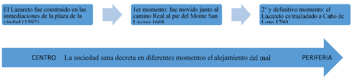 Lotman plantea un enfoque semiótico para describir la necesidad que tiene una comunidad de alejar el mal, en lo que él describe como la relación centro-periferia. En el caso concreto de Cartagena de Indias, el hospital de San Lázaro fue construido el 16 de diciembre de 1592, en la esquina que cae en el último remate de Getsemaní, frente al fuerte de El Boquerón; esto es, dentro de la ciudad. Esto generó protestas de los vecinos. En un segundo momento fue construido en las afueras, junto al camino real, al pie del monte que hoy en día lleva el nombre de San Lázaro. Por muchos años, el hospital estuvo localizado cerca del castillo San Felipe, donde estaba ubicada la salida de la ciudad por la puerta de la Medialuna hacia el este, como narra Juan de Ulloa (Aristizabal: 1998).