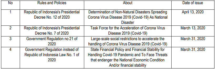 Seeing that the world is struggling to control the spread of Covid-19, strategic steps are needed to slow the spread of this virus. One of those steps is making Covid-19 an international emergency (Cucinotta & Vanelli: 2020, pp. 157-160). In line with whose statement establishes the coronavirus outbreak as an international emergency status on January 31, 2020, and as a global pandemic on March 11, 2020, the Indonesian government officially established a non-natural national disaster status against the COVID-19 epidemic on April 11, 2020. Several emergency measures then also begin to follow.